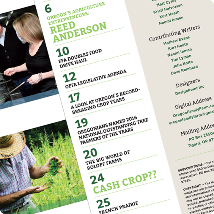 From the magazine’s inception, DesignPoint has had the pleasure of working with the Oregon Family Farm Association to design it from the ground up — creating a flexible framework for building articles and advertisements. For each issue, writers, photographers, and advertisers send content to us so we can work our magic to fit the information within the magazine’s framework and make it visually appealing to readers.