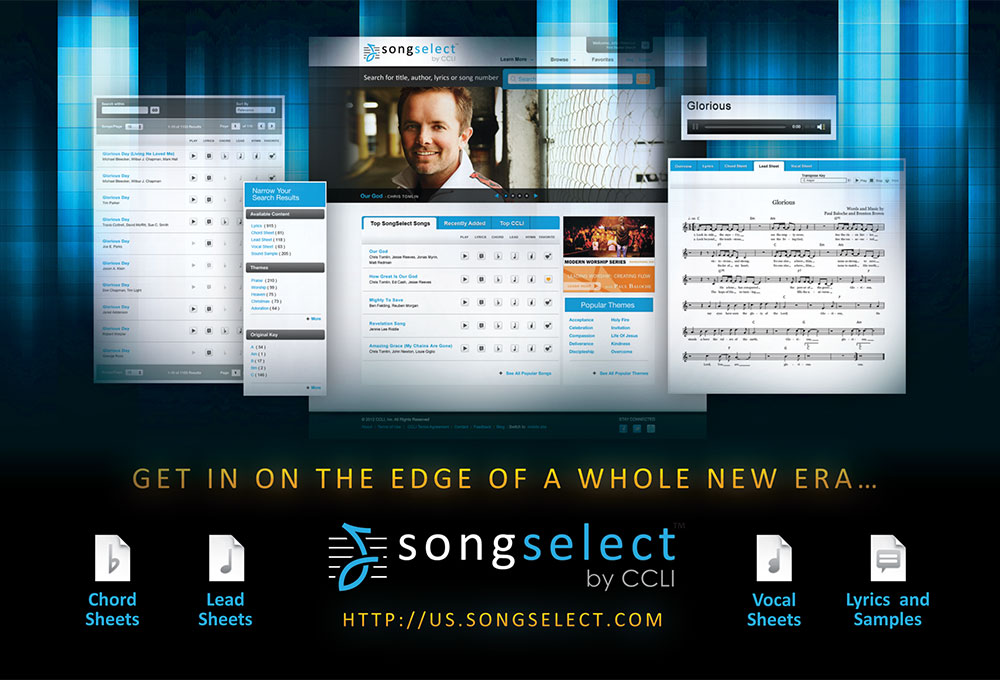 SongSelect is an online subscription service from Christian Copyright International providing chord sheets, lead sheets, vocal sheets, lyrics and sound samples to over 60,000 churches.