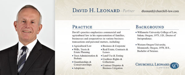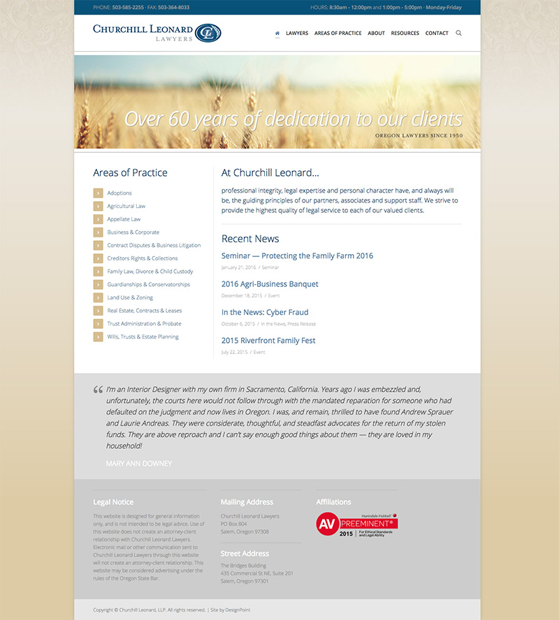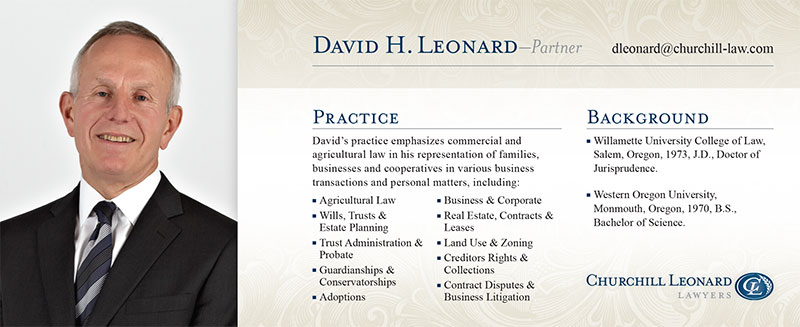 Churchill Leonard is a law firm in Salem, Oregon that represents small and large businesses, private individuals, financial institutions, trusts and estates. Their lawyers each focus on specific areas of practice to better serve their clients with their legal needs.